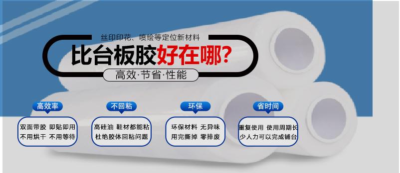 •印花台板胶膜在印花过程中固定布料,防止其移位或脱落,胶体平整,不回粘布料,保证布料的品质。