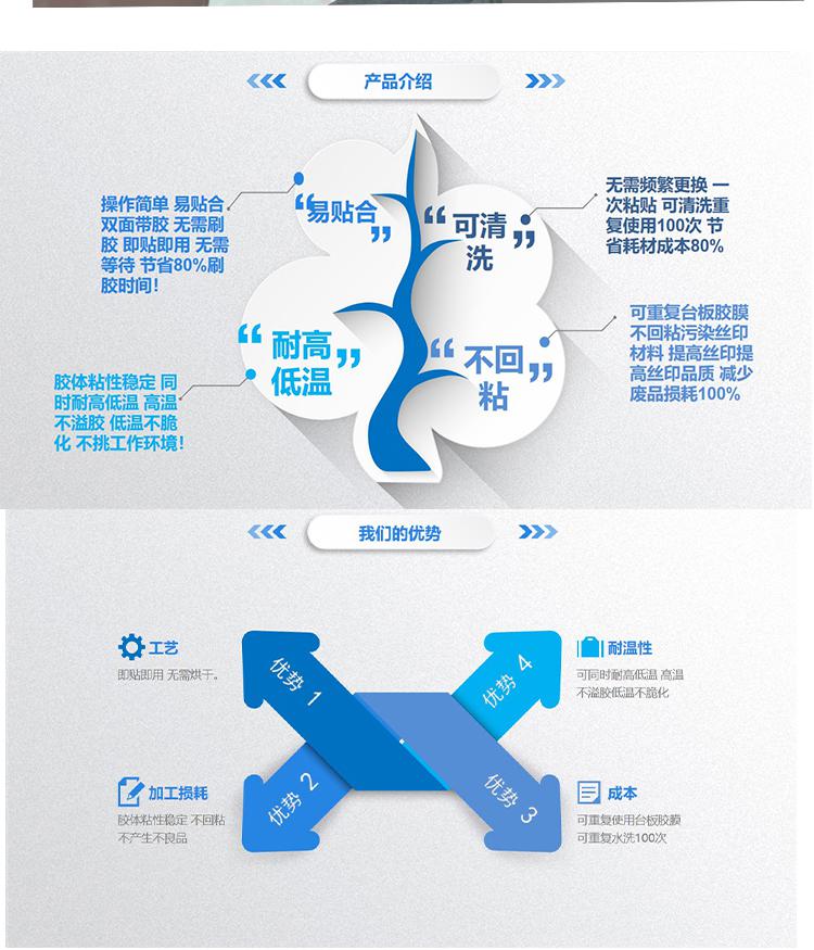 成本:可重复使用,降低了生产成本和浪费; 效率:一贴即用降低时间成本,提高工作效率; 胶体平整,不回粘布料,降低印花次品率。